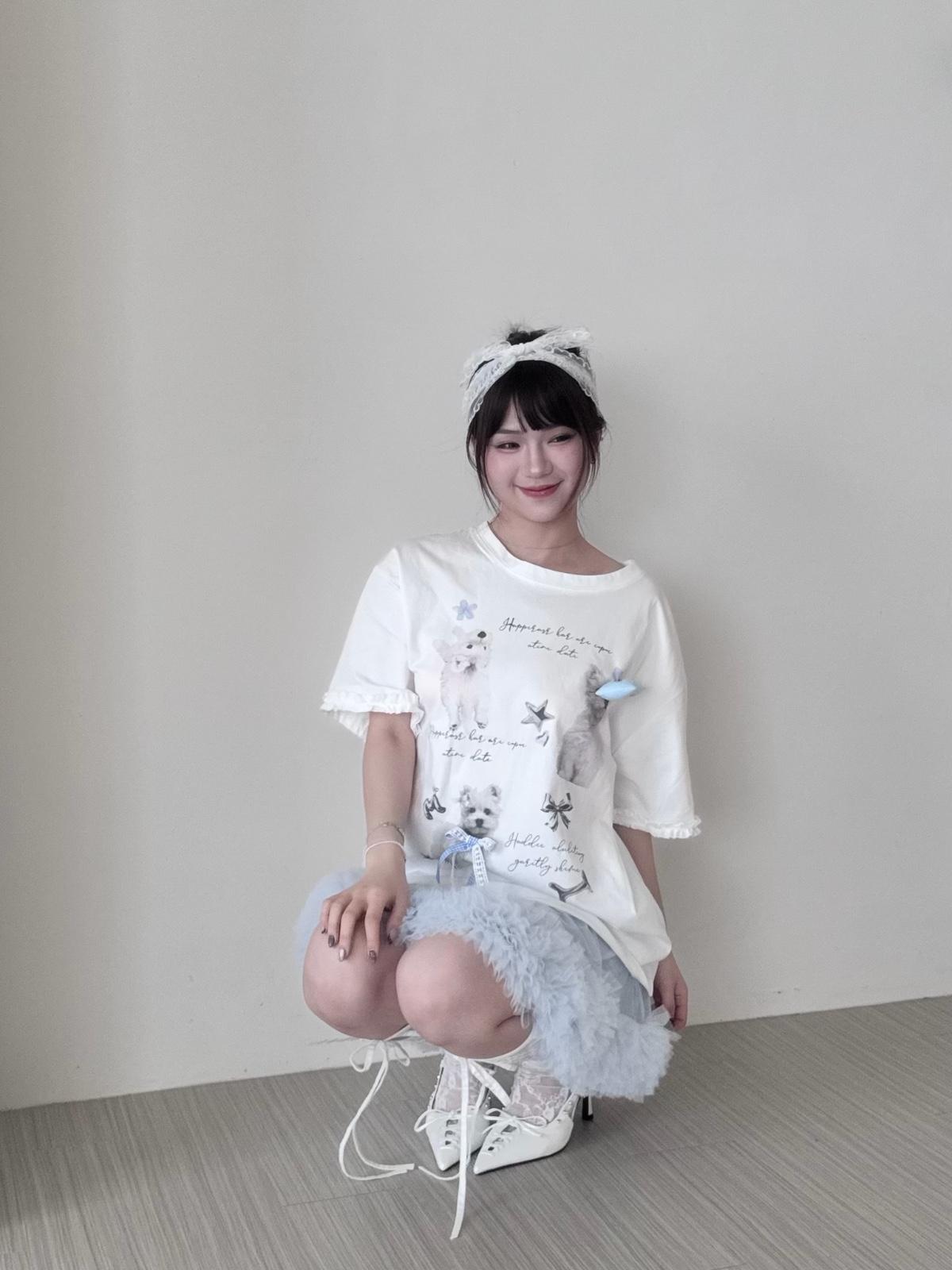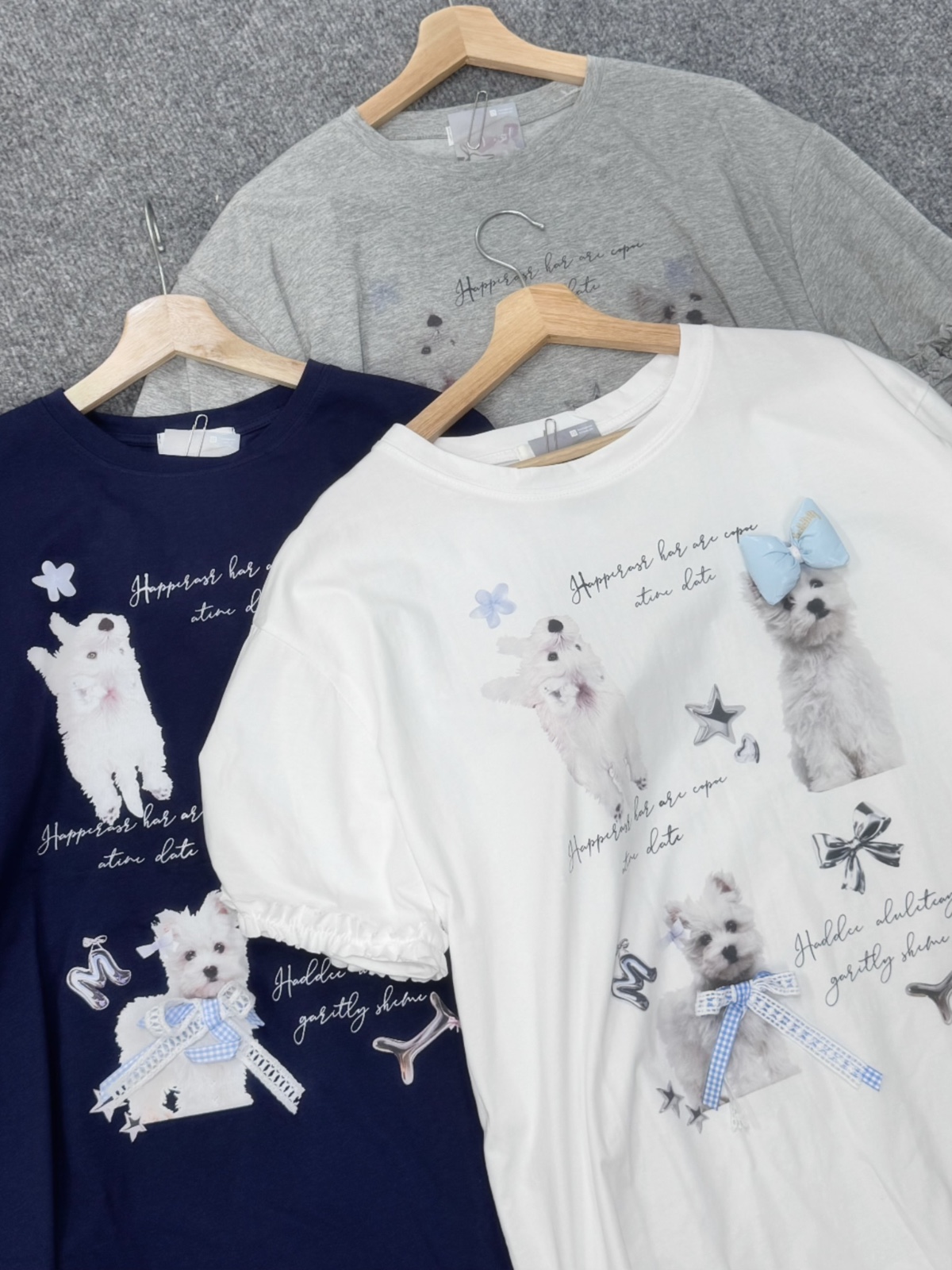#T0601可愛狗狗拼接荷葉邊T恤(3colors)-立體蝴蝶結活動式可調整